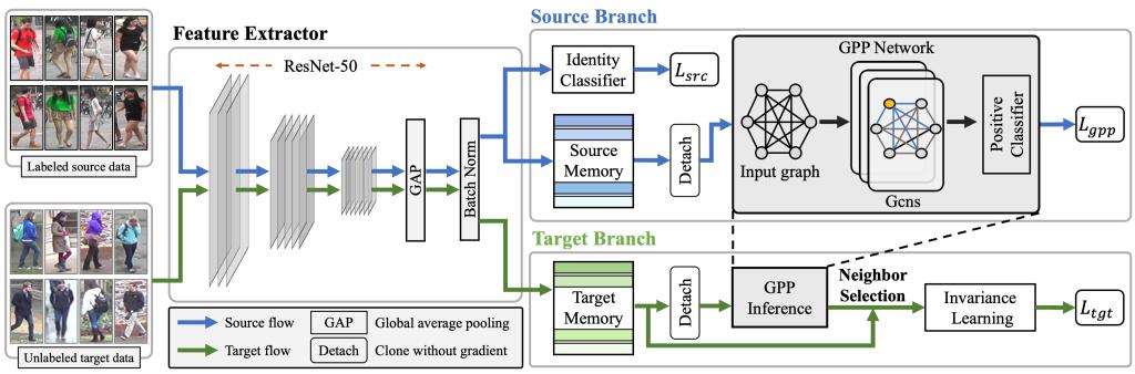 李绍滋教授团队提出了一种基于记忆模块的行人再识别域自适应方法,旨在解决行人再识别中的场景迁移问题,从而提升模型的跨场景下的性能。该方法明确并全面地探讨了目标域的域内变化,并基于记忆模块提出了一个新颖的域自适应框架,从而有效地在深度网络中实现三种不变性约束。此外,该方法在记忆模块的基础上了还提出了一种基于图的正样本预测方法(Graph-based Positive Prediction, GPP),用以充分利用样本之间的关系,从而有效提升域自适应过程中的不变性学习。实验结果证明了该方法相对于国际领先方法的有效性和优越性,其结果在 Market-1501,DukeMTMC-reID 和 MSMT17 三个数据集上的域自适应结果大大超过了现有方法。