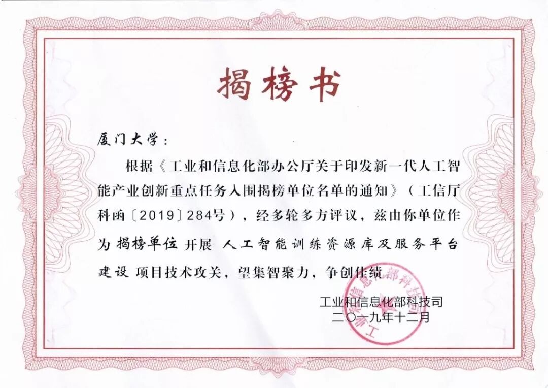 2019年12月24日,工信部“新一代人工智能产业创新重点任务入围揭榜单位”揭晓,我系纪荣嵘教授团队主持、中国科学院软件所和数据堂参与的“人工智能训练资源库及服务平台建设”项目入围揭榜单位。