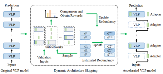 近年来,视觉语言预训练(VLP)模型的规模和计算量不断增加,导致将这些模型迁移到下游任务时的开销也越来越大。最近的研究重点关注了VLP模型参数高效迁移学习(PETL),该方法仅需更新少量参数即可实现模型任务迁移。然而,大量的计算开销仍然困扰着VLP的应用。因此,本文致力于研究VLP模型参数和计算的高效迁移学习(PCETL)。需要特别注意的是,PCETL不仅要限制VLP模型中可训练参数的数量,还注重减少推理过程中的计算冗余,以实现更高效的传输。为实现这一目标,本文提出了一种新的动态架构跳过(DAS)方法。DAS不是直接优化VLP模型的内在架构,而是通过基于强化学习的过程观察模块对下游任务的重要性,然后使用轻量级网络跳过冗余模块。这样一来,VLP模型的迁移过程能够有效地将可训练参数保持在较低水平,同时加快对下游任务的推理速度。