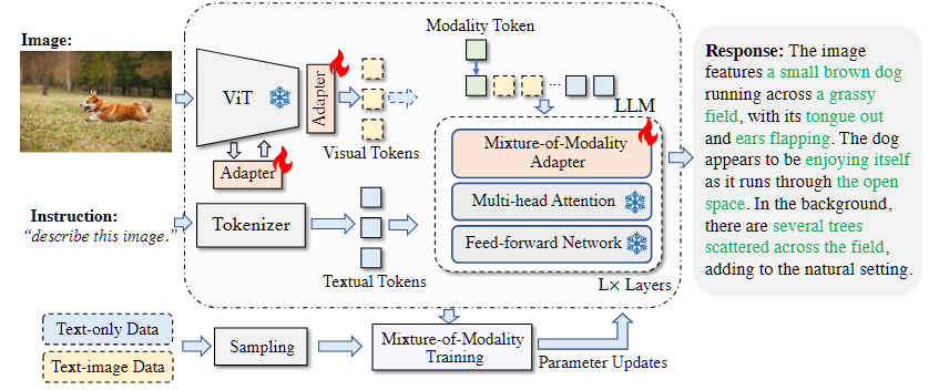 本文提出了一种新颖且经济实惠的解决方案,用于有效地将 LLMs 适应到 VL(视觉语言)任务中,称为 MMA。MMA 不使用大型神经网络来连接图像编码器和 LLM,而是采用轻量级模块,即适配器,来弥合 LLMs 和 VL 任务之间的差距,同时也实现了图像模型和语言模型的联合优化。同时,MMA 还配备了一种路由算法,可以帮助 LLM 在不损害其自然语言理解能力的情况下,在单模态和多模态指令之间实现自动切换。