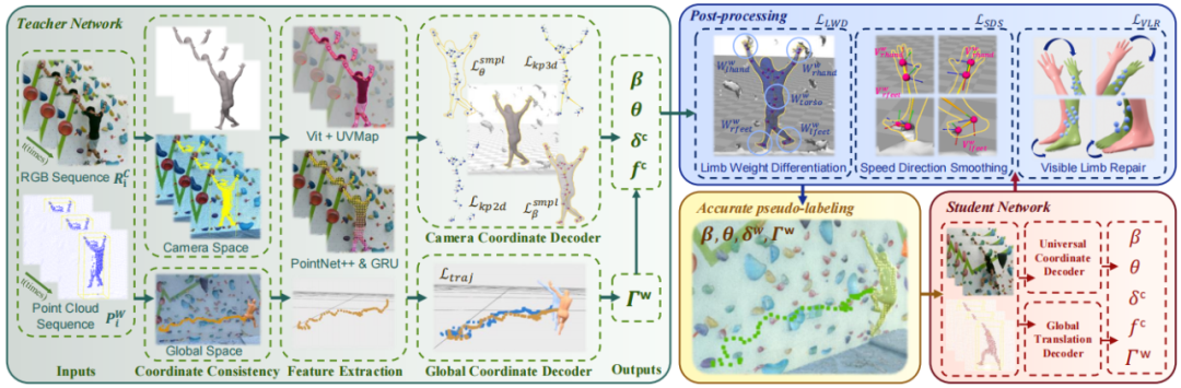 简介:攀岩是一类新兴的运动,风靡全球备受青睐。我国在2024年奥运会上获得了两枚攀岩银牌,通过攀岩动捕算法对攀岩动作进行精细分析能够有助于提高运动员训练效果,提高比赛成绩。但是现有国际上动作捕捉算法对攀岩动作的准确度较低,有两个原因,一是现有的攀岩数据集数量有限,二是现有攀岩算法没有充分考虑全局坐标系4D人体攀爬运动恢复。本文收集了一个大规模、质量高且具有挑战性的攀爬运动数据集AscendMotion,提出了采用RGB相机和激光雷达在全局坐标系中对4D人体攀爬运动进行运动恢复的动捕算法ClimbingCap。实验验证了该数据集的质量以及本文提出的攀岩动捕算法的有效性。