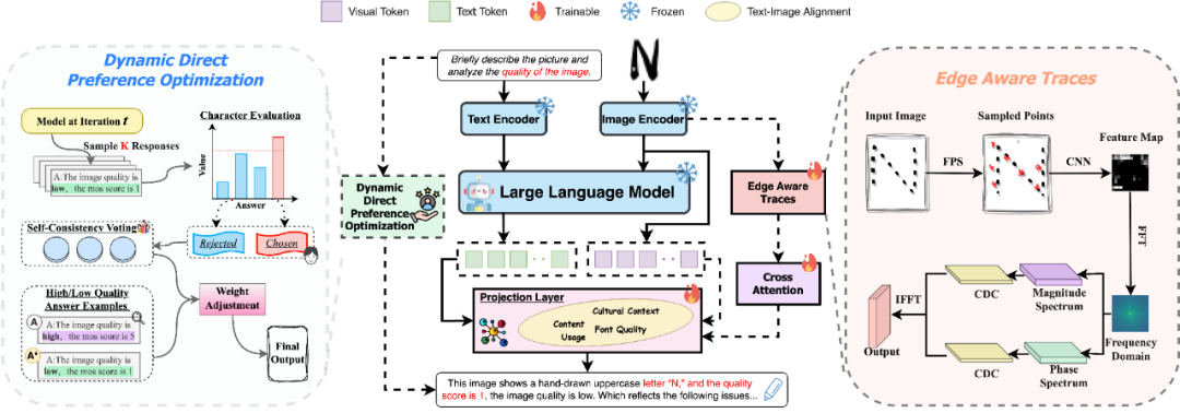简介:随着生成模型的蓬勃发展,字体生成取得了显著进展,但对其可解释性与评估仍然不足。为此,本文构建了含13.5万字体-文本对的多模态数据集DFD,涵盖多种生成字体类型、语言描述与质量注释,为字体分析模型的训练与评估奠定了坚实基础。基于此,本文提出了VLM架构的Font-Agent,引入EAT模块捕捉字体笔画边缘信息,并通过D-DPO策略高效微调模型,赋予解释性问答能力。实验证明,Font-Agent在DFD及其他公开数据集上均表现突出,不仅能精准评估生成字体质量,也能深度理解其内容。在多样化数据集上的实验也验证了其泛化性能,彰显了Font-Agent的潜力。