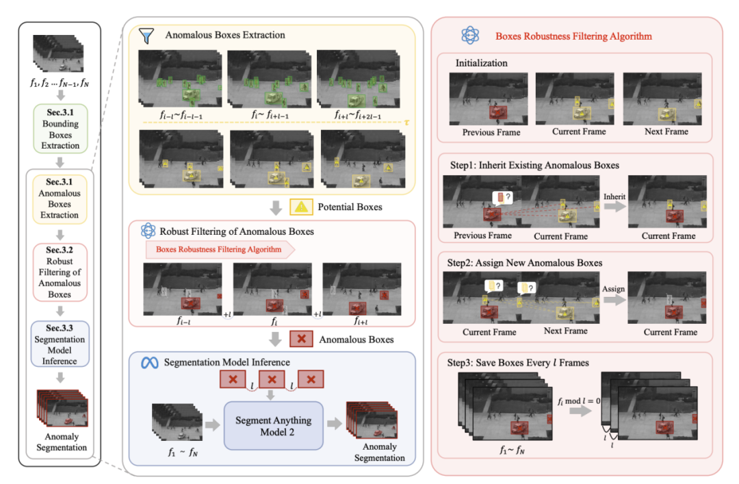 Track Any Anomalous Object: A Granular Video Anomaly Detection Pipeline简介:本文提出了一种创新的视频异常检测框架,该框架引入了一种细粒度视频异常检测框架,首次将多个细粒度异常对象的检测整合到一个统一的框架中。现有方法主要聚焦于识别视频中的异常对象,通常通过检测异常帧或异常目标来实现。然而,这些方法往往忽略了更精细的异常像素级分析,从而限制了其捕捉更广泛异常的能力。与传统方法在每个时间点为每个像素分配异常分数的方式不同,本文方法将问题转化为异常目标的像素级跟踪。通过将异常分数与图像分割和视频跟踪等后续任务相结合,该方法无需人工设定阈值,从而实现了更加精确的异常定位,即使在长时间且具有挑战性的视频序列中也能表现出色。在大规模数据集上的实验结果表明,该方法达到了最先进(state-of-the-art)的性能,为视频异常检测提供了一种实用、细粒度且全局化的解决方案,推动了该领域的新进展。该论文共同第一作者是厦门大学信息学院2023 级硕士生黄誉之和香港中文大学博士生李宸鑫,通讯作者为信息学院黄悦教授。此外,该研究由信息学院2024级研究生张海涛和丁兴号教授共同合作完成。