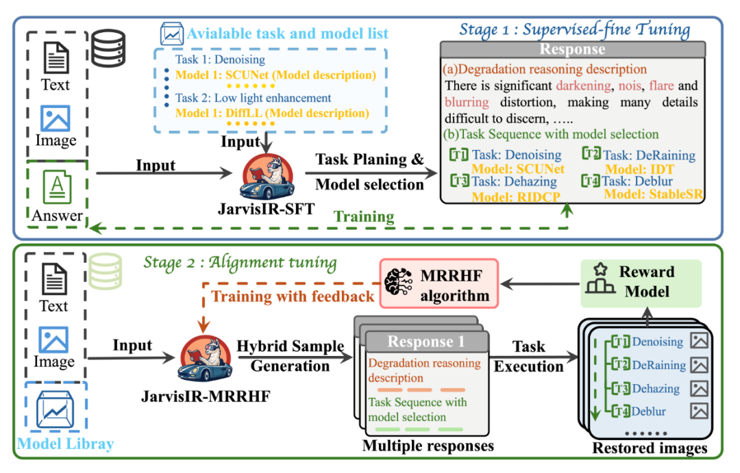 JarvisIR: Elevating Autonomous Driving Perception with Intelligent Image Restoration简介:以视觉为中心的感知系统在复杂自然环境中常面临不可预测且相互关联的天气退化问题。现有解决方案存在明显局限,既可能依赖特定退化先验知识,又容易受到显著领域差异的影响。为实现真实场景下的鲁棒自主运行,本文提出JarvisIR,一种基于视觉语言模型的智能体,利用VLM作为控制器来统筹多个专家修复模型。该系统采用包含监督微调与人类反馈对齐的双阶段创新框架,有效提升系统鲁棒性、减少模型幻觉,并增强恶劣天气下的泛化能力。针对真实场景中配对数据稀缺的挑战,人类反馈对齐机制使VLM能够通过无监督方式在大规模真实数据上高效微调。为支撑JarvisIR的训练与评估,本文构建了CleanBench综合数据集,包含15万组合成数据和8万组真实数据的高质量指令-响应对。实验结果表明,JarvisIR展现出卓越的决策与修复能力:在CleanBench-Real测试集上,其感知指标平均提升达50%。该论文主要共同第一作者是厦门大学信息学院2023 级硕士生林云龙和林子旭,通讯作者为信息学院丁兴号教授,由潘攀望(字节跳动)、陈浩宇(香港科技大学)、李文博(华为诺亚方舟实验室)等共同合作完成。