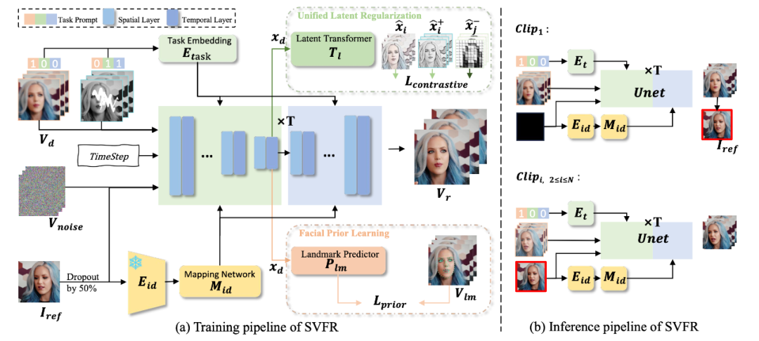 简介:人脸修复(FR)是图像和视频处理领域的一个重要方向,主要关注从降质的输入中重建高质量的人物肖像。尽管图像人脸修复(FR)已有显著进展,但对视频人脸修复(FR)的探索仍然相对较少。此外,传统的人脸修复通常侧重于提升分辨率,可能未充分考虑到诸如人脸上色和补全等相关任务。本文提出了一种新颖的方法用于广义视频人脸修复(GVFR)任务,该方法整合了视频BFR、补全和上色任务,且通过实验证明这些任务能互有增益。本文设计了一个统一的框架——稳定视频人脸修复(SVFR),利用稳定视频扩散(SVD)的生成和运动先验,并通过统一的人脸修复框架融入任务特定信息。本文引入了可学习的任务嵌入以增强任务识别能力,同时采用了一种新颖的统一潜在正则化(ULR)策略,鼓励不同子任务之间共享特征表示学习。为了进一步提升修复质量和时序稳定性,本文引入了面部先验学习和自参考优化作为训练和推理中的辅助策略,所提出的框架有效地结合了这些任务的互补优势,增强了时序一致性并实现了优越的修复质量。该工作推动了视频人脸修复的最新进展,并为广义视频人脸修复奠定了新的范式。