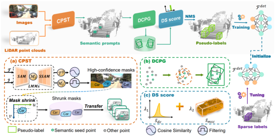 简介:稀疏监督目标检测方法在标注量极度缺乏时很难保持性能。本文提出SP3D方法,利用跨模态的语义提示显式增强稀疏监督3D目标检测性能。本文首先引入可信点语义迁移模块,利用多模态大模型和图像数据生成高可信度的跨模态语义提示。其次,将语义提示作为种子点,通过动态伪标签生成策略和分布形状得分生成高质量伪标签。最后,使用少量的标注数据对检测器进行微调。在KITTI和Waymo数据集上的实验结果表明,SP3D显著提升了SoTA稀疏监督目标检测器的性能,在零样本设置中也表现优异。