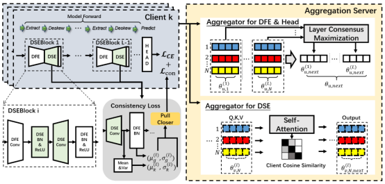 Federated Learning with Domain Shift Eraser简介:联邦学习(FL)中用户的数据域转移现象常常阻碍用户模型学习一致的表示空间。为此,本文提出了一种个性化联邦FL框架——联邦域偏差消除器(FDSE),通过差异化消除每个客户的领域偏差并增强其共识来提升模型性能。具体而言,FDSE将模型前向传播过程建模为一个迭代的去偏过程,交替进行共识增强的特征提取和个性化域偏差消除。实验表明了FDSE方法在准确性、效率和泛化性方面的优势。该论文第一作者是厦门大学信息学院2022级博士生王铮,通讯作者是王程教授。由王子徽博士(鹏城实验室),王郑,范晓亮高级工程师共同合作完成。