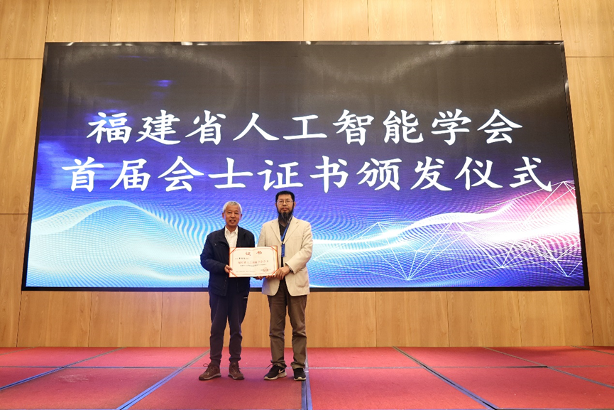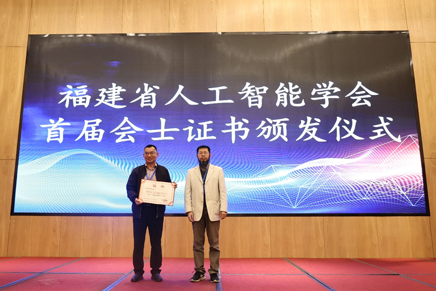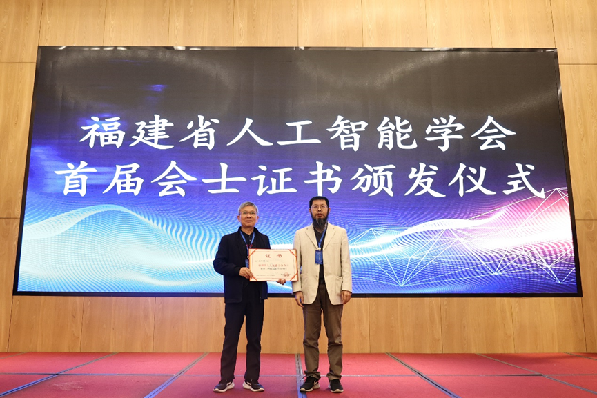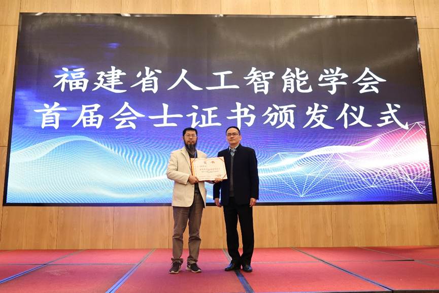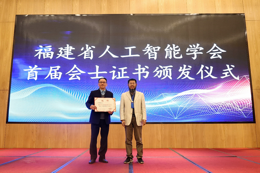 会议现场举行了福建省人工智能学会首届会士证书颁发仪式。经过资格审查、提名、全体理事投票,厦门大学周昌乐教授、曾文华教授、李绍滋教授,福州农林大学郭躬德教授、集美大学陈水利教授当选福建省人工智能学会首届会士。